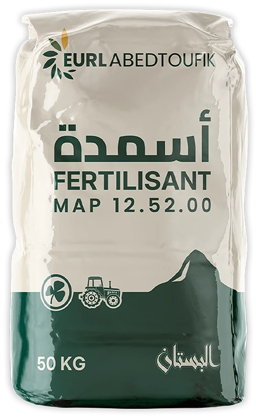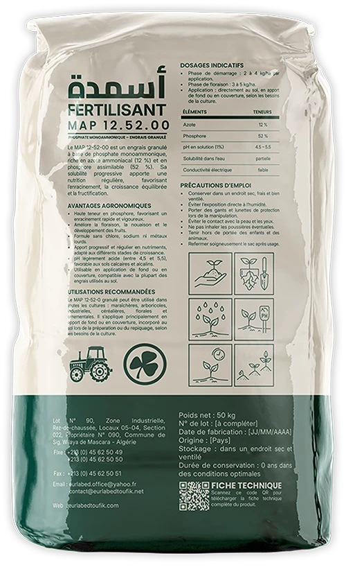 Le MAP 12-52-00 (Phosphate Monoammonique) est un engrais riche en phosphore (52 % P₂O₅) et en azote ammoniacal (12 % N). Il favorise un enracinement rapide, stimule la germination et assure un bon démarrage des cultures. Son pH légèrement acide le rend particulièrement adapté aux sols calcaires et aux systèmes de fertilisation modernes.